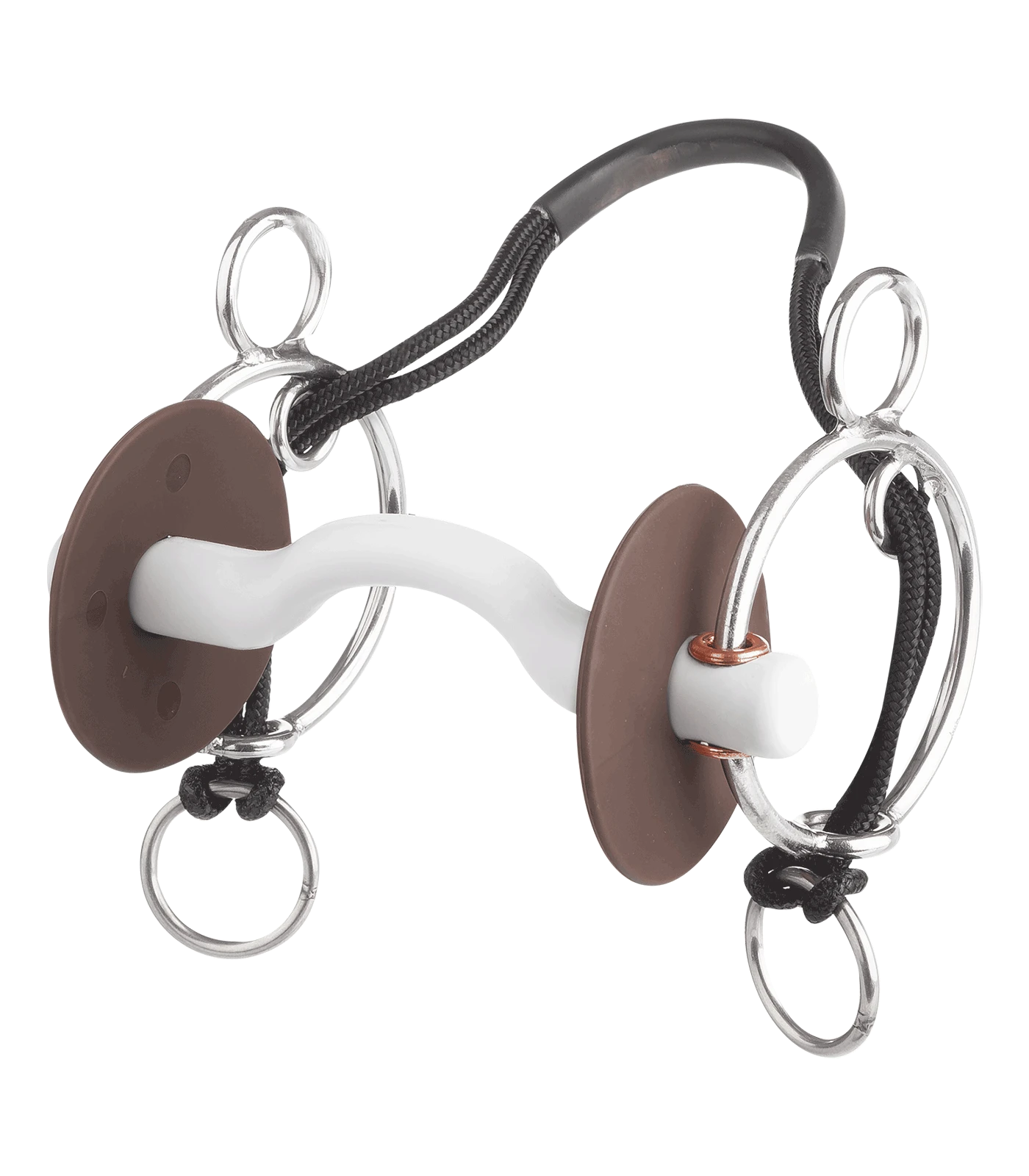 The tongue port bar has an especially flattened shape to the port. This gives the tongue optimum room. Many horses respond to this with improved suppleness and increased chewing. This bit is also very well suited to horses that play with their tongues, trying to get their tongue over the bit, as the port effectively prevents this. With a height of 30 mm the port is fully permissible under German equestrian sport regulations. This mouthpiece is thus eminently suited to horses that do not tolerate traditionally shaped bits due to the pressure on the tongue and react by head-shaking or similar. This bit ensures optimum pressure distribution on lower jaw and moth, is very well accepted by horses. The second rein acts like a chin strap, which can be taken up and released. This bit is very good for particularly strong and forward-going horses.