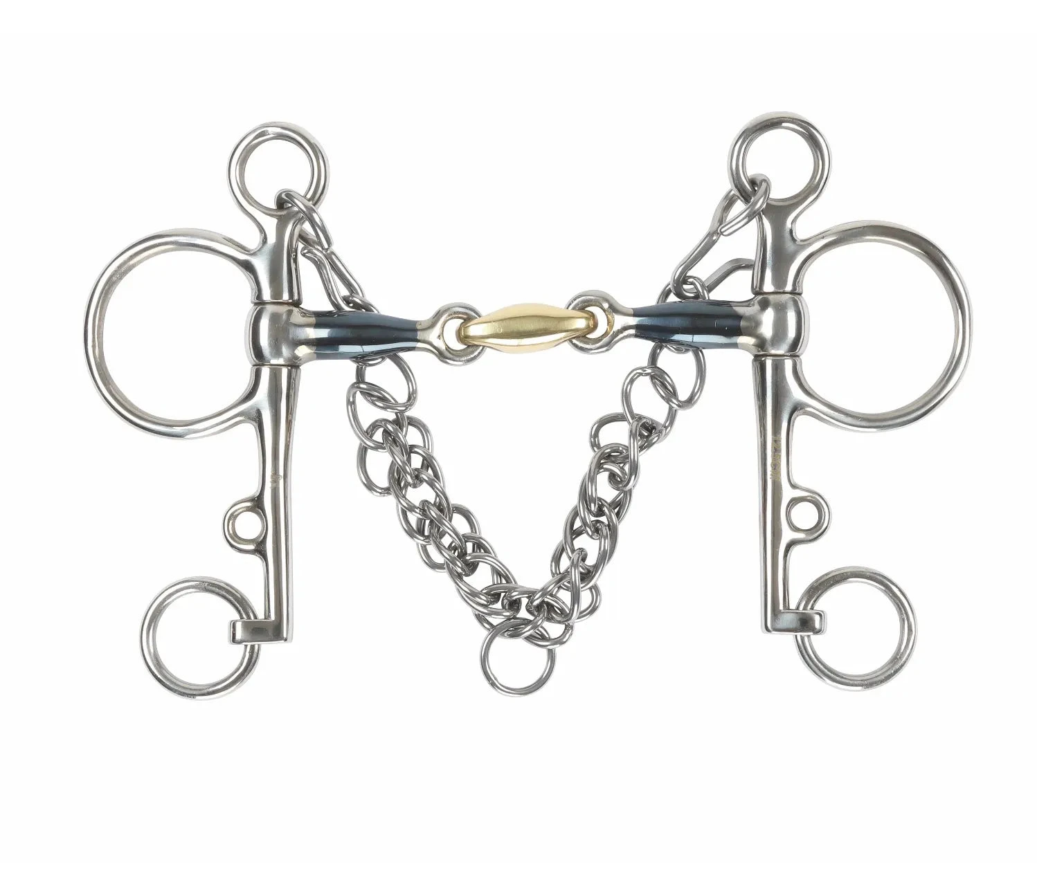 This bit is often used to help with control. The lozenge distributes pressure over both the tongue and bars of the mouth. Can be used with double reins or Pelham roundings.